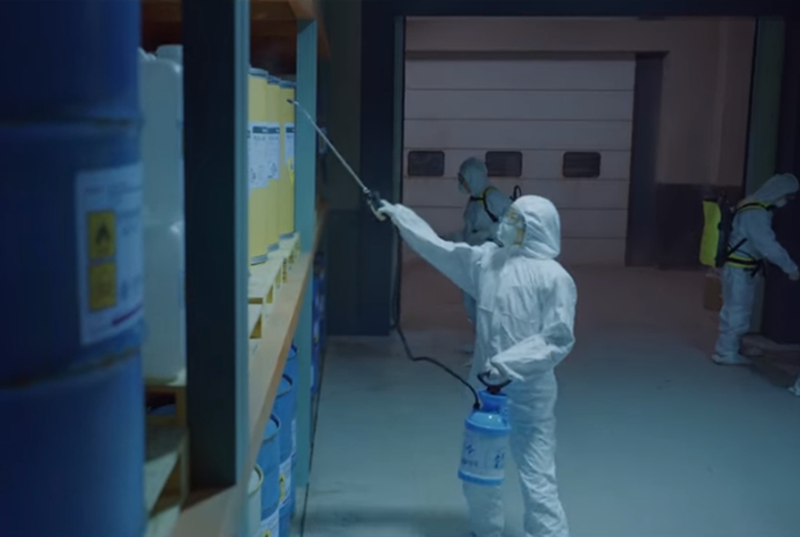 RDU-90 원료를 보관하는 창고에 야간 정기 방역하러 온 사람들. 연구원들은 방역을 위해 모두 밖으로 나가고 방역하는 사람들은 창고 구석구석 방역을 하며 무언가를 뿌립니다. 그리고 방역을 끝내고 차에 탄 그들 중 한 명은 라이터를 켜며 던져버리죠. 바로 빈센조. 그리고 홍차영과 피실험자들의 유족들입니다.