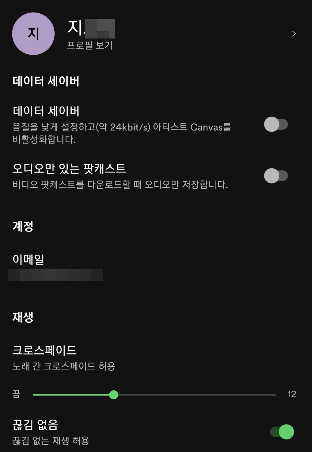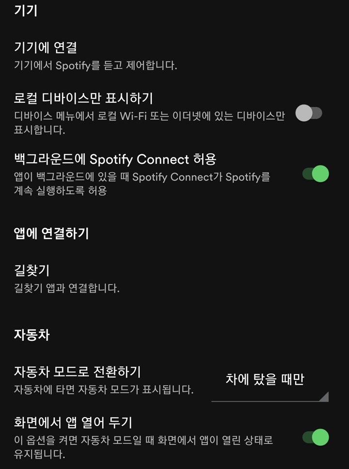 홈 화면 오른쪽 상단에 바퀴모양을 한 '설정' 아이콘을 선택하면 스포티파이 음악을 즐기기 위한 여러 가지 기능을 설정할 수 있는 곳입니다. 재생, 볼륨, 기기, 자동차 모드 등을 설정할 수 있습니다.