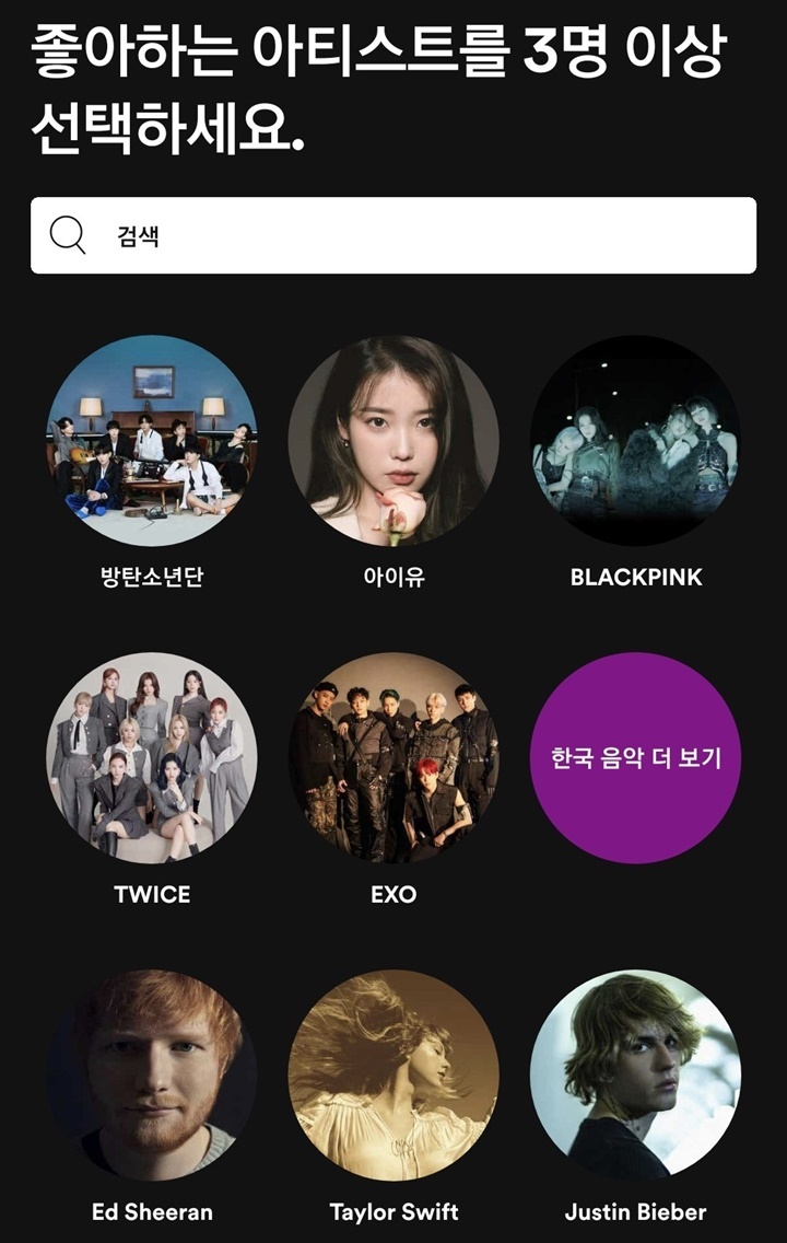 비밀번호 8자리를 설정하고 생년월일과 성별, 그리고 이름을 입력하면 가입이 완료됩니다. 그리고 첫 화면에서 개인의 맞춤 서비스를 위해 좋아하는 아티스트를 고르는 것으로 시작합니다.