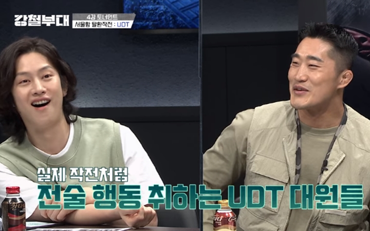 결승전을 앞둔 네 팀 중 UDT는 바다로, 특전사는 산으로 향했습니다. 벚꽃이 피는 봄날이었는지 UDT의 육준서가 감미로운 목소리로 노래를 부르자 함께 따라 부르는 정종현. 그만 감미로움이 확 깨지게 만들어주셨습니다.