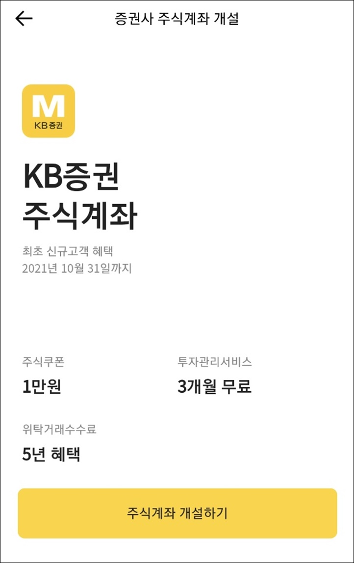 현재 KB증권의 계좌개설 시 주식 쿠폰 1만 원의 혜택과 5년의 수수료 면제 혜택이 주어집니다. 한국투자증권은 국내 또는 해외 인기 있는 주식 6천 원을 주고 수수료 평생 우대해주는 혜택이 있습니다. 그 외 NH투자증권, 하나금융투자증권의 계좌개설이 가능합니다.