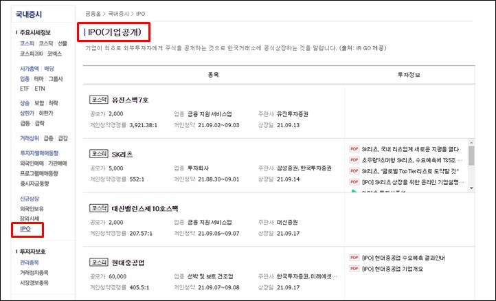네이버의 국내 증시에서 왼쪽 메뉴 아래로 가시면 'IPO' 메뉴가 있습니다.