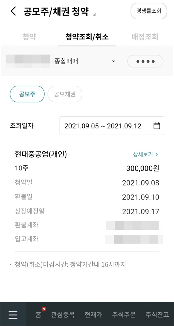 현대 중공업 공모가가 6만 원으로 기본 10주를 신청하면 60만 원이 됩니다. 하지만 100% 모두 증거금으로 신청되는 것이 아니라 60만 원의 50%만 청약증거금으로 신청이 가능합니다. 그래서 30만 원을 해당 계좌에 입금시키시면 됩니다.