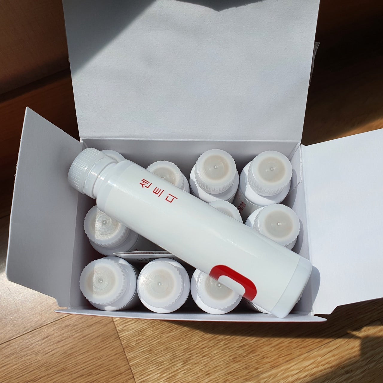 센트디 한 병은 25ml로 애플 페논이 원액이 들어가 있어요. 살짝 맛을 봤는데 진한 사과 맛과 풋사과의 떫은맛이 좀 강하게 느껴졌어요. 그냥 먹기에는 너무 진한 맛이었죠. 반드시 물에 타서 먹어야 하는 이유가 있더라고요.