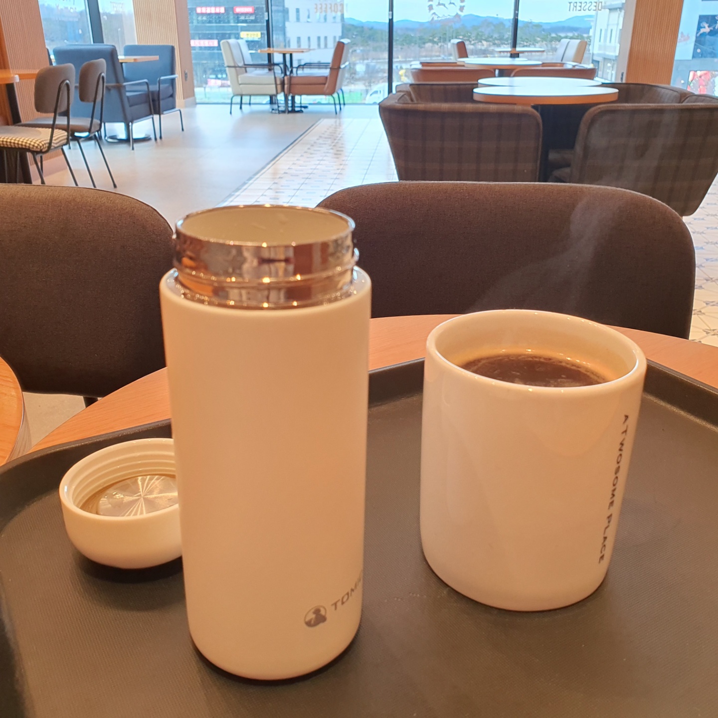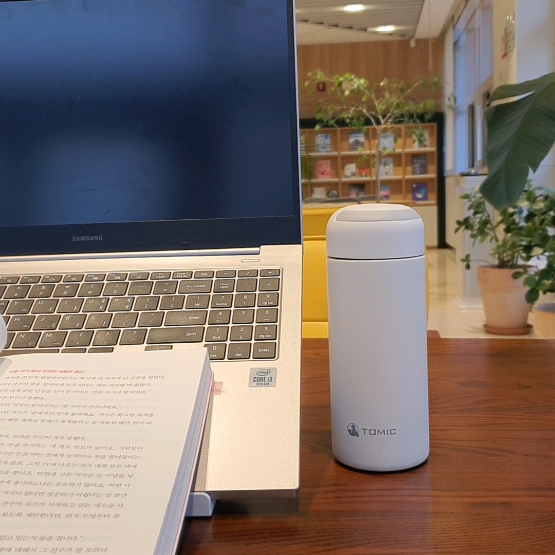 지금 카페에서 커피를 텀블러에 테이크아웃해 와서 도서관에서 5시간 넘게 따뜻하게 마시고 있습니다. 차망을 분리한 채 보틀에 뚜껑을 닫아 들고 왔더니 휴대하기도 편하고 가방에 부피를 덜 차지하고 좋았습니다. 노트북에 다이어리, 읽을 책, 필기구까지 숄더백에 담아왔습니다.