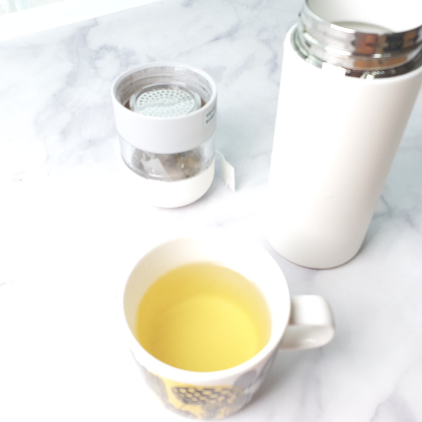 텀블러 가운데 있는 유리로 된 차망에 잎차 또는 꽃차를 넣고 색이 우러나오는 것도 티타임의 즐거움이 되었습니다. 히비스커스애플차를 타면 붉은색이 우러나고 캐모마일 차를 타면 부드러운 노란색이 우러나옵니다.