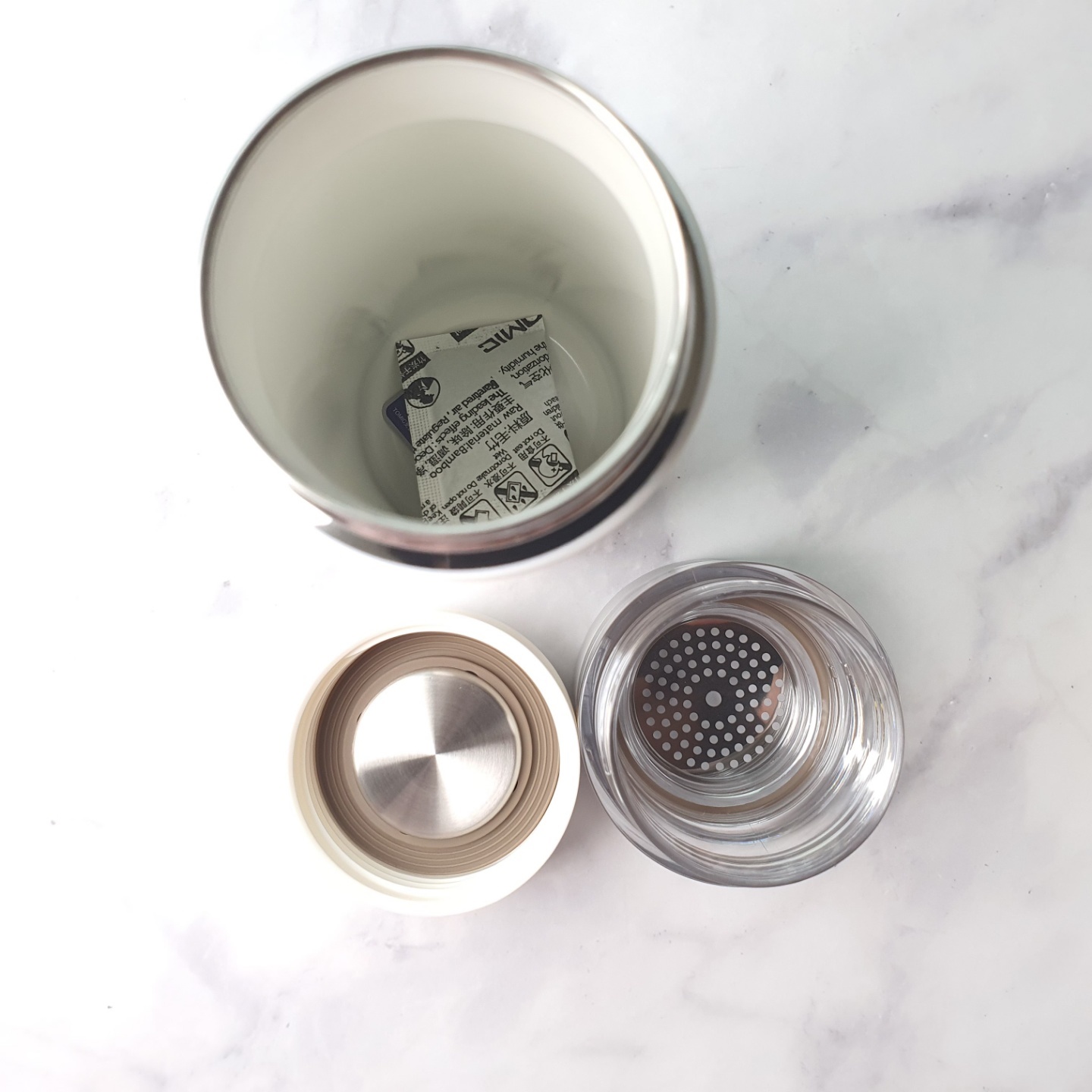 토믹 세라믹 텀블러가 도착해서 언박싱해보니 텀블러 상자와 작은 솔이 하나 들어가 있습니다. 매우 저렴해 보이지만 보틀 청소하기에는 부드럽고 좋습니다. 토믹 세라믹 텀블러는 3개로 구성이 되어 있습니다. 보틀(본체), 차망, 뚜껑 3가지인데 사용방법에 따라 3단 합체 또는 2단 합체가 가능합니다.