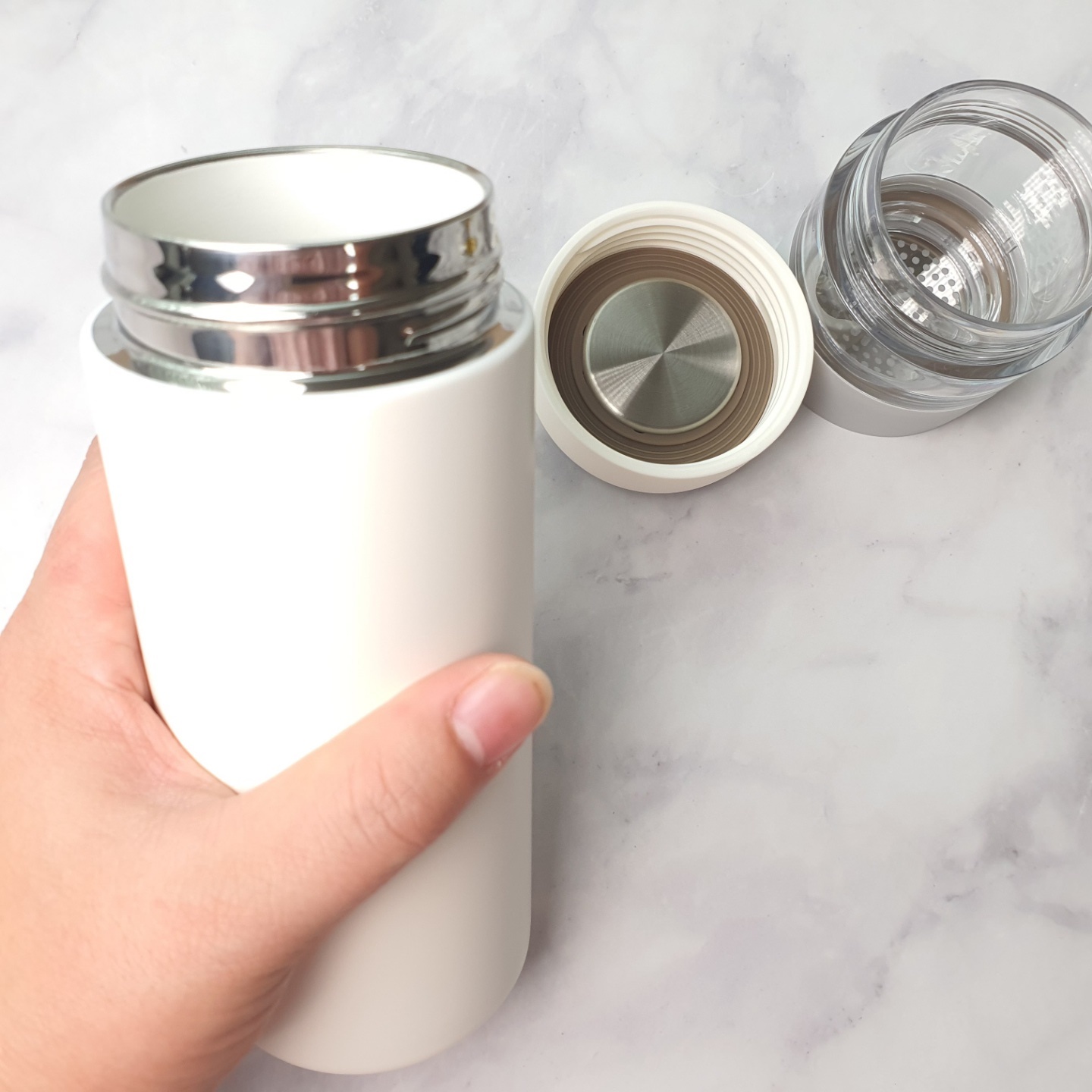 잎차 또는 티백을 우려먹을 때 차망을 이용해 차를 우려낸 후 그대로 뚜껑을 닫고 다녀도 되는 3단 합체 방법과 차를 우려낸 후 차망을 빼고 뚜껑만 잠궈 오래도록 따뜻하게 마실 수 있는 2단 합체가 됩니다. 가끔 카페에 가서 테이크아웃해도 될 정도로 용량은 넉넉한 편이네요.