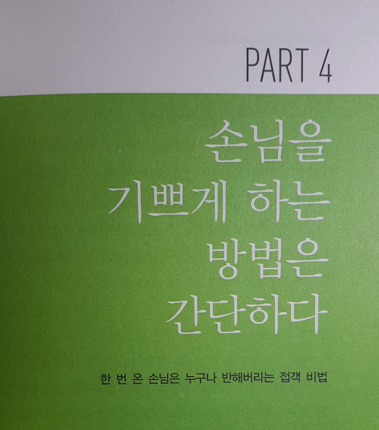 낯을 가리는 성격은 사람 상대할 때 부담감이 크게 작용할 때가 있다. 저자는 말주변이 없어도 문제없는 토크 요령이 있다고 한다. 가게 소품이나 음식메뉴만으로도 이야기를 나눌 수 있다. 그리고 머릿속에 이야기를 나눌 수 있도록 이미지화하는 연습을 해 보는 것도 도움이 된다고 생각한다. 그리고 자주 방문하는 손님들의 이름을 알아두는 것도 접객의 기본 중의 기본이야. 그리고 내 가게가 한가하다는 것은 무조건 마이너스지. 손님을 접객하는 가게에서는 절대 쓸 수 없는 말이라고 한다.
